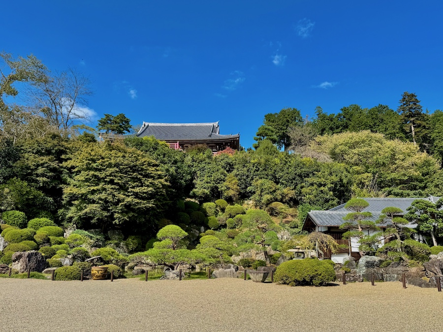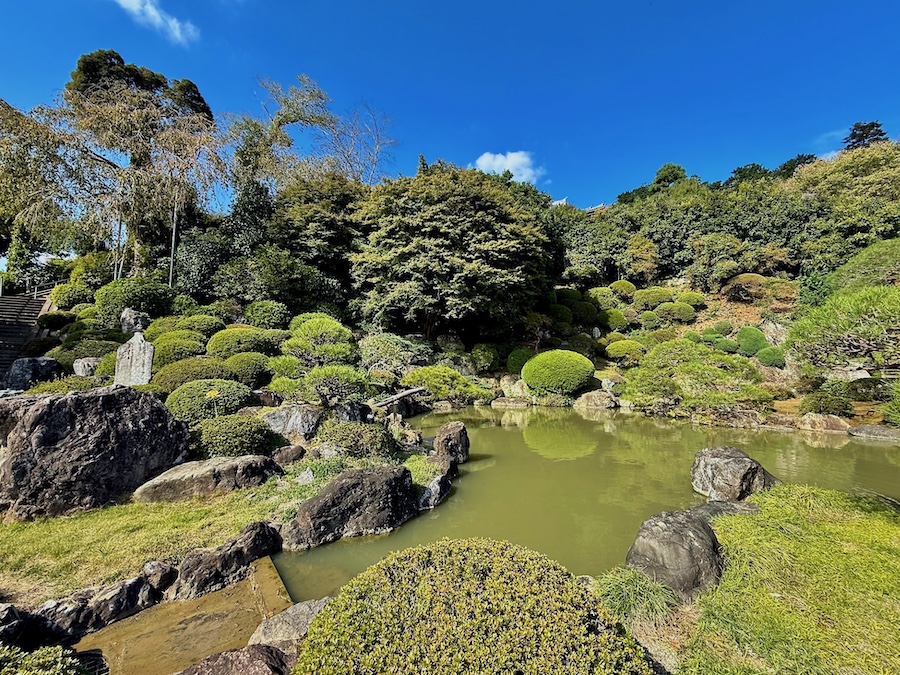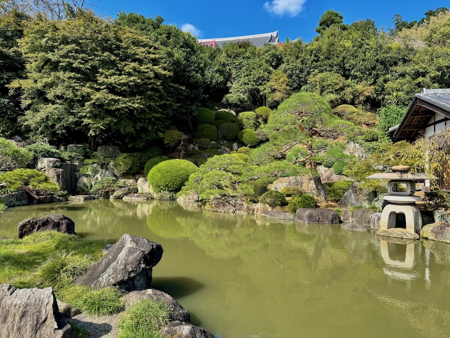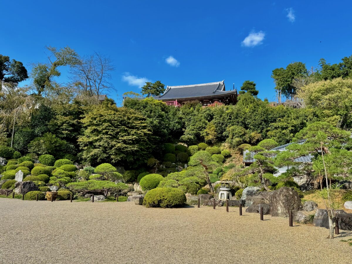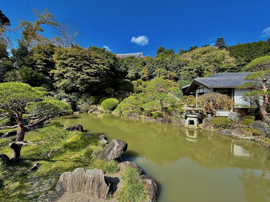 現在、主庭園がある場所にかつて本堂があり、本堂が高台部に移ったのちにこの庭園は作庭されました。自然の斜面・岩盤と植栽を活かしながら、その中に滝石組やサツキの刈込、よくお手入れされたマツなどが美しい庭園。客殿側からの視点もきっと素晴らしいはずですが、正面から、左手側の階段の途中から、そして本堂の前の見晴らし場からと様々な角度から楽しめるお庭!