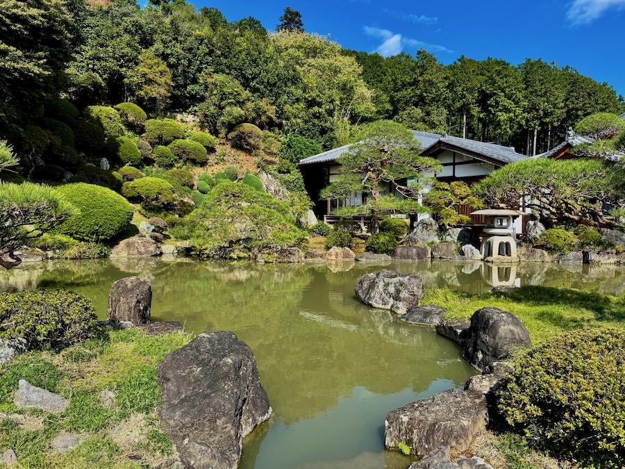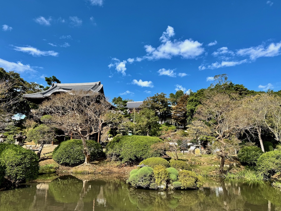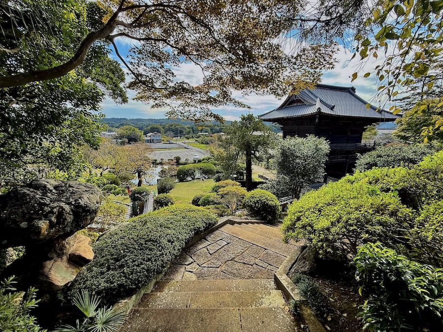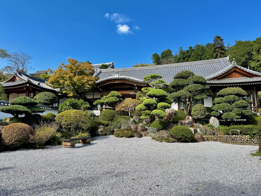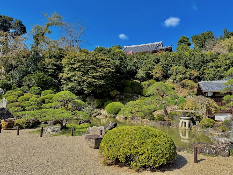 現在、主庭園がある場所にかつて本堂があり、本堂が高台部に移ったのちにこの庭園は作庭されました。自然の斜面・岩盤と植栽を活かしながら、その中に滝石組やサツキの刈込、よくお手入れされたマツなどが美しい庭園。客殿側からの視点もきっと素晴らしいはずですが、正面から、左手側の階段の途中から、そして本堂の前の見晴らし場からと様々な角度から楽しめるお庭!