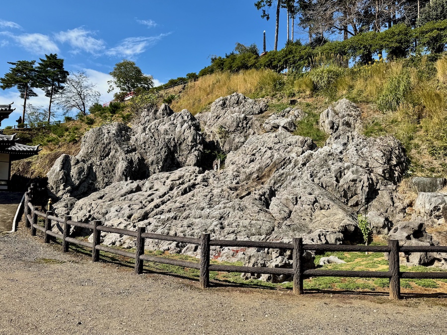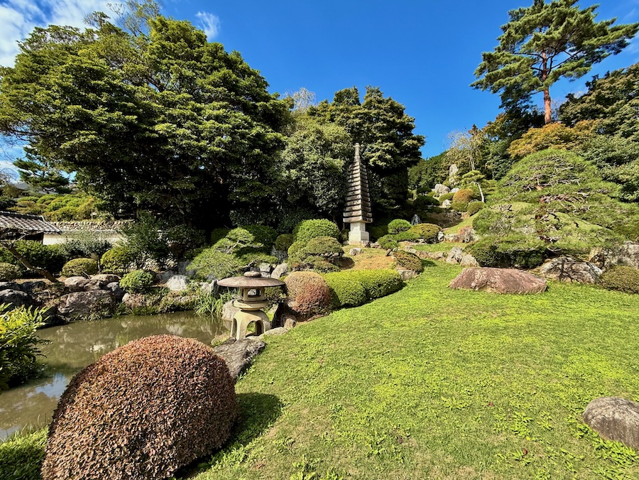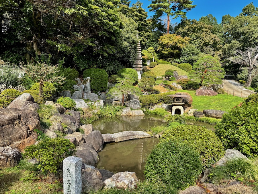 その山門の脇に、同じく市指定文化財(史跡)の『高麗王若光の墓』があります。小さな建物の中にある石の多層塔が鎌倉時代以前に制作されたものと言われます。そして、その並びにある池泉式庭園『高麗殿池』にも「史跡」の石碑が。