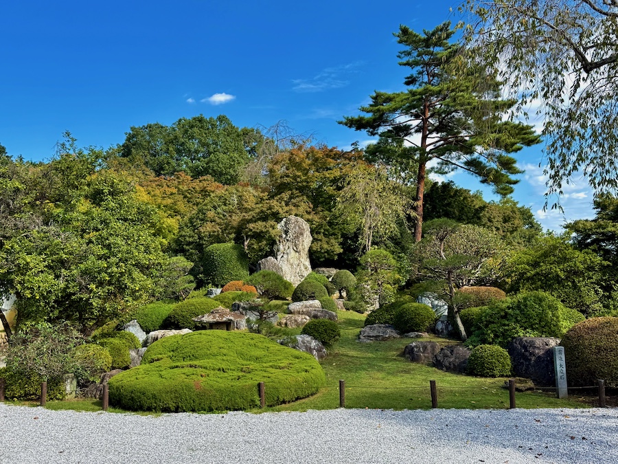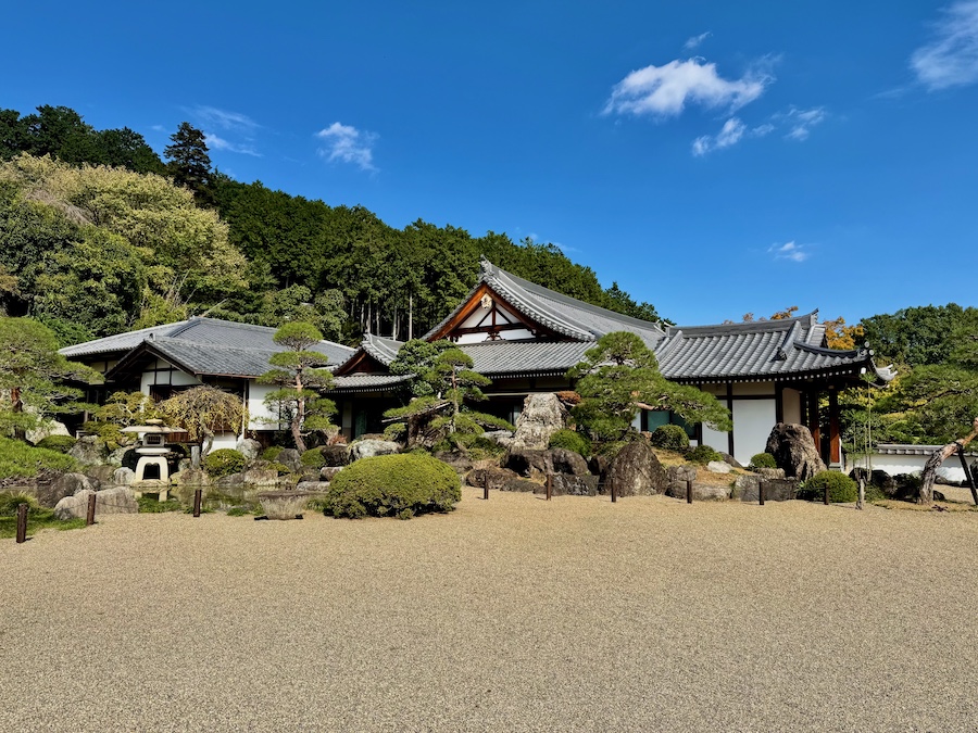 客殿の玄関の前には、寄進された「大庭石」と中心とした枯山水庭園が。そして、本堂の脇にはこの山から出現した自然石(石灰岩)による石庭「雪山」の姿も楽しめます。高台部からの眺望も素晴らしい!