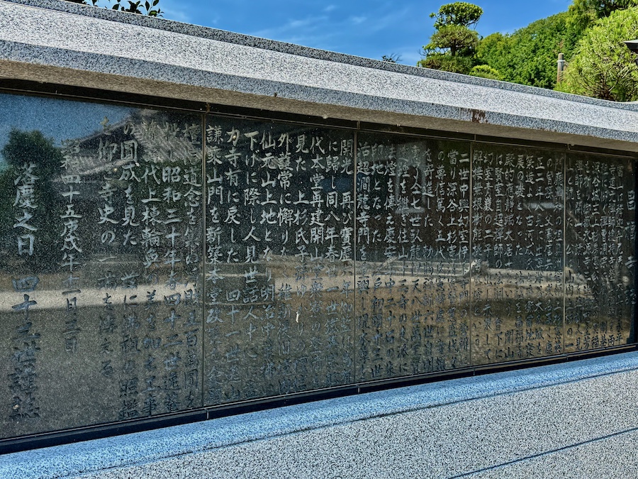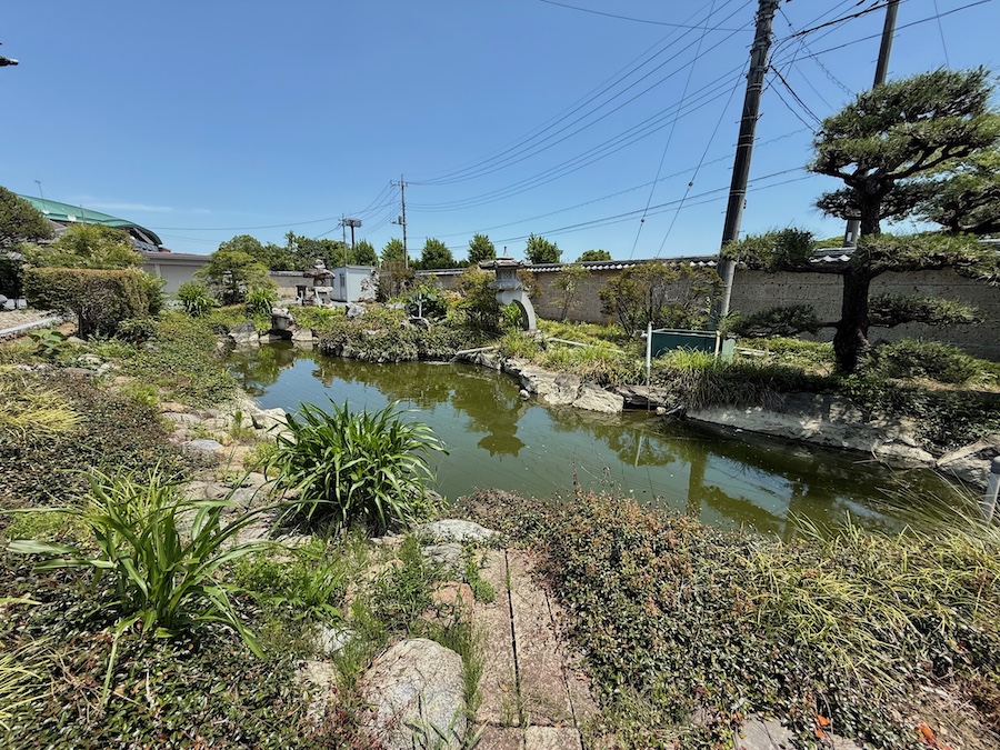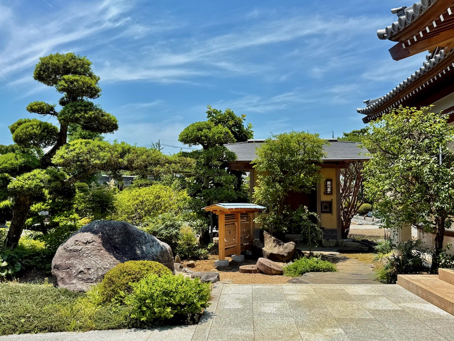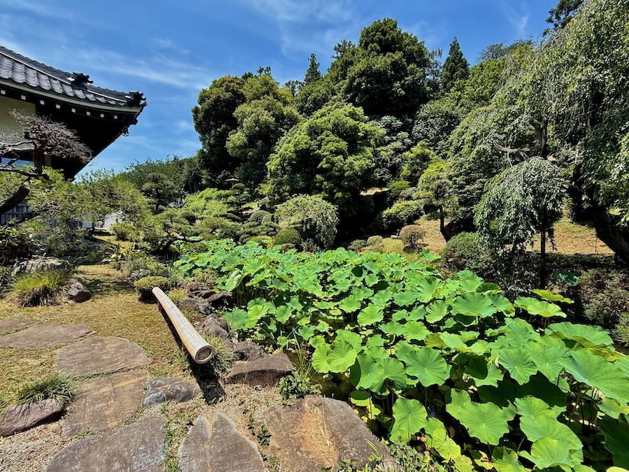 本堂・書院の正面に心字池をおき、仙元山の斜面を活かした池泉庭園。春には池向かって右手側の桜の木やツツジ・サツキ、夏には池中に多くのハスが花を咲かせ、そして秋には紅葉が楽しめる庭園。なお、池泉のほとりには1977年(昭和52年)に地元の造園会社・「松華園」松崎さんにより池の護岸の工事が行われた石碑が。書院の前の枯山水はその際に作庭されたものかな。