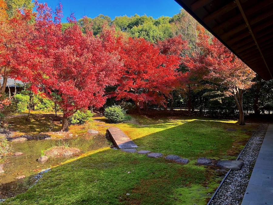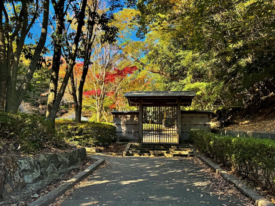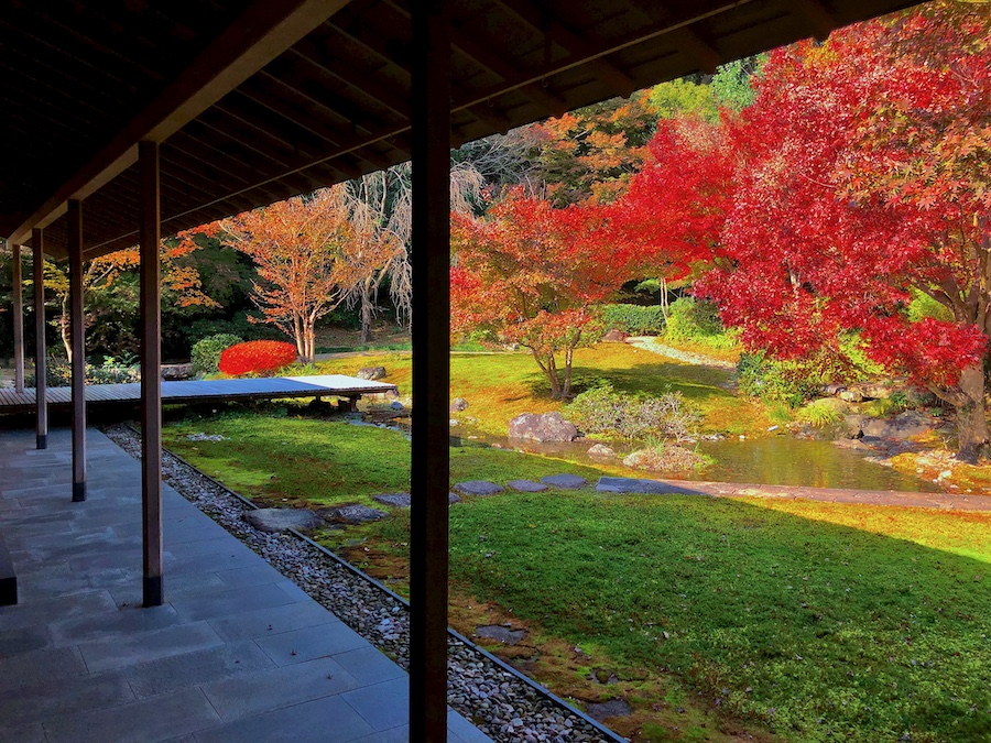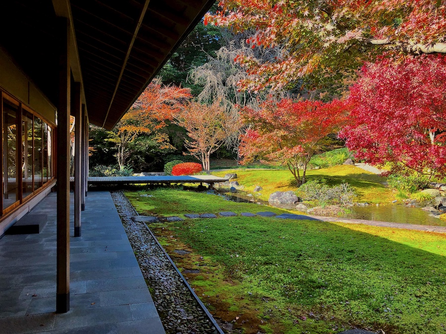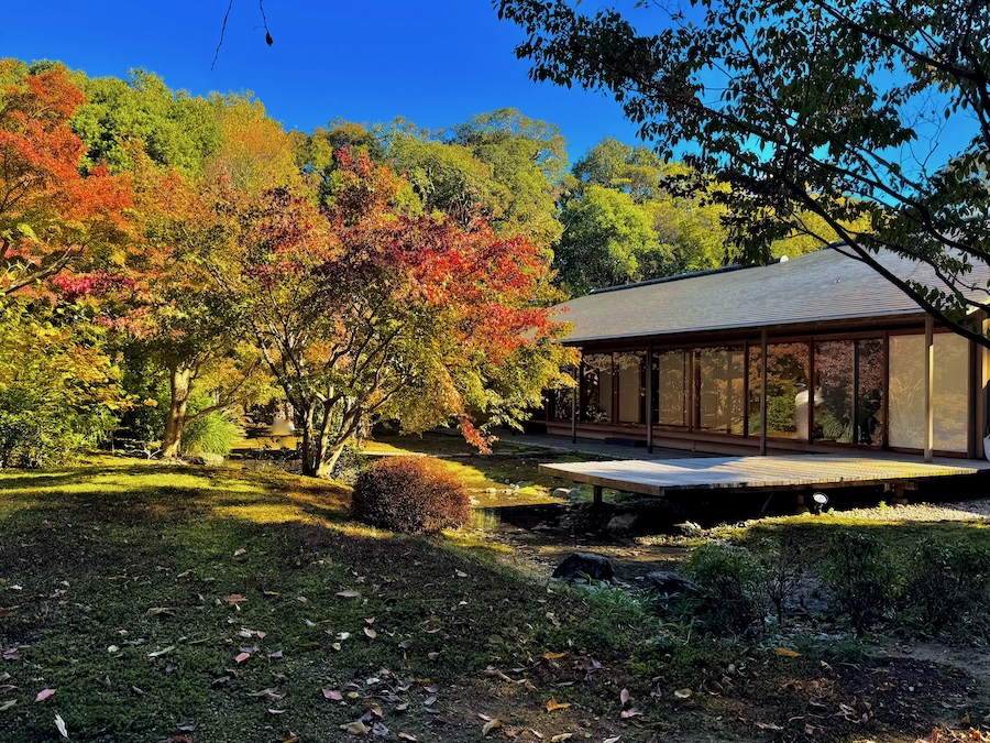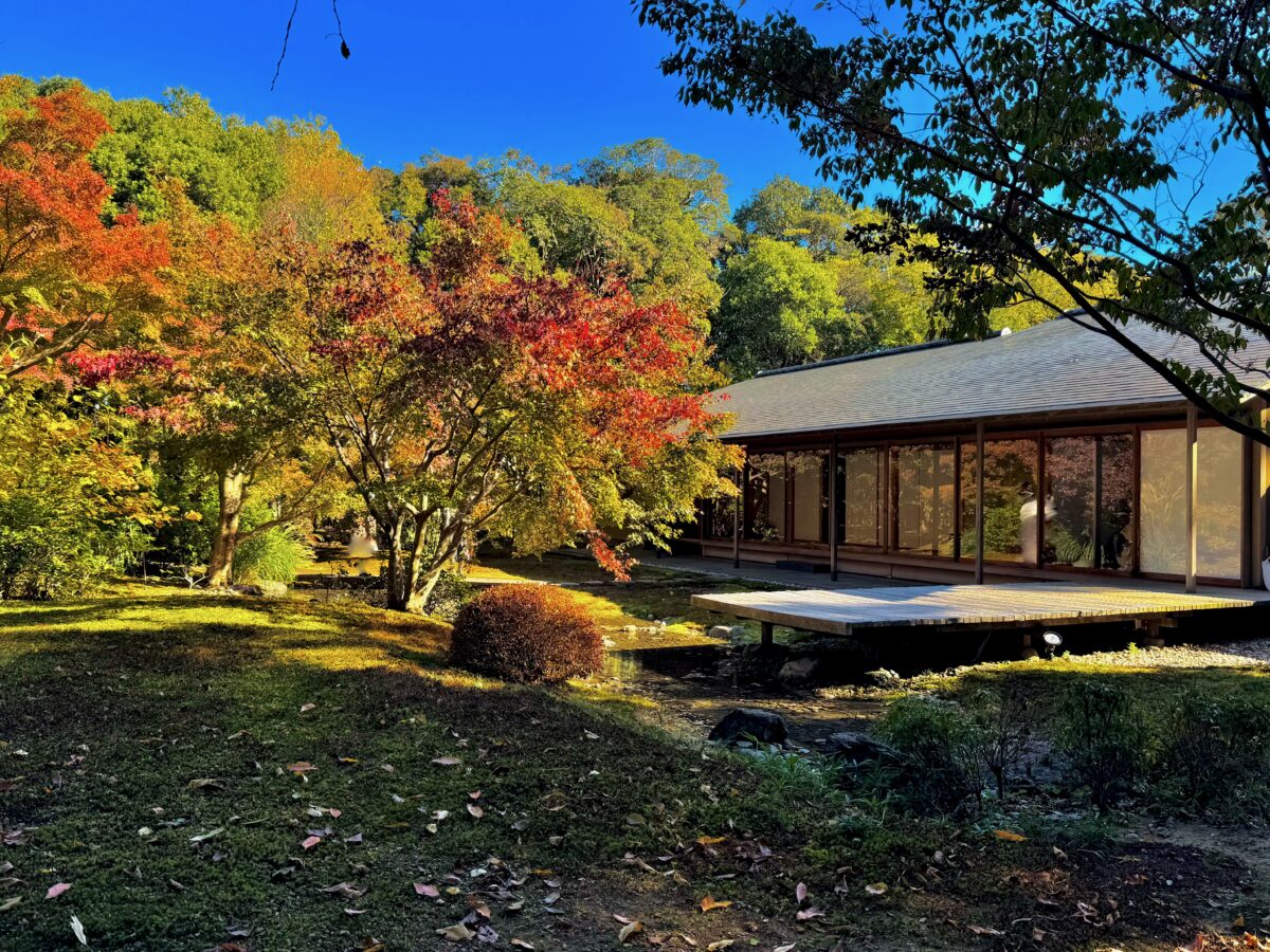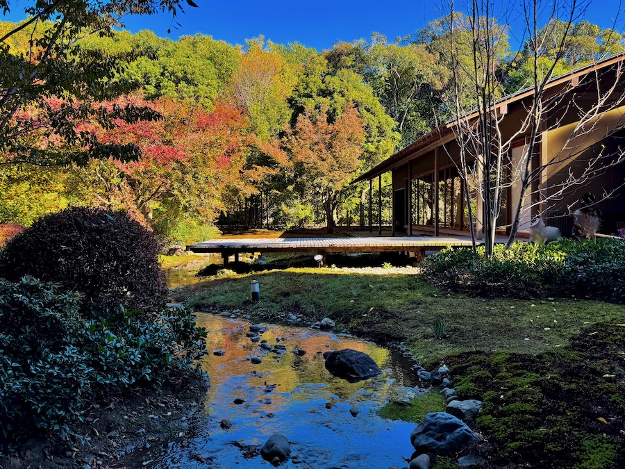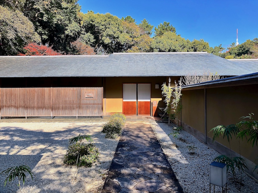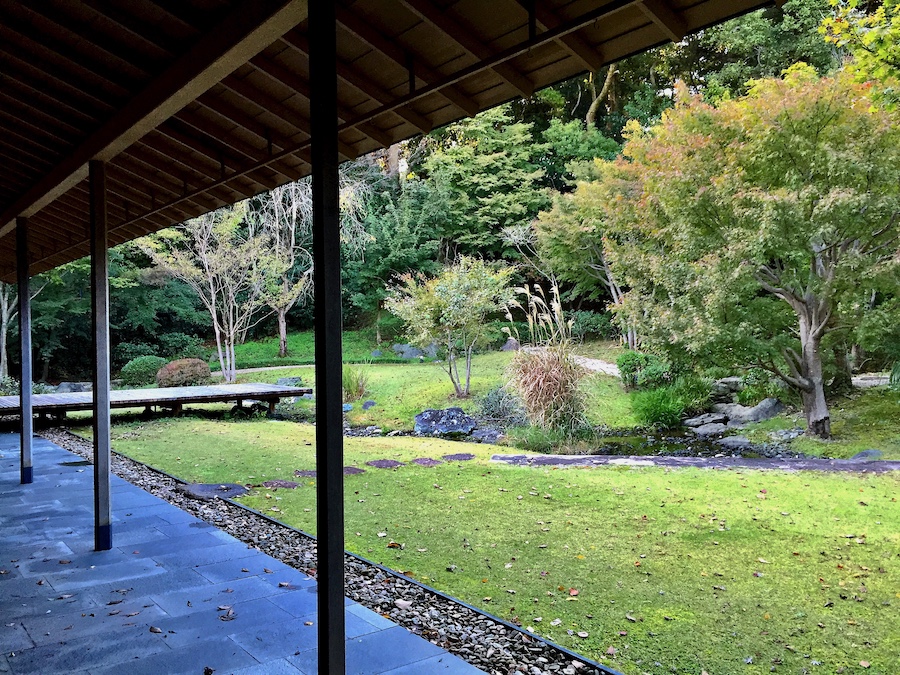 豊田市美術館の童子苑とこの松韻亭、いずれも谷口吉生さんの残した稀少な純和風建築でめちゃくちゃ素敵な空間ですが、全く異なる印象を受けるのは「庭園」。主棟から萩庵まではごく緩やかな斜面になっていて、その中に小川の“流れ”が設けられた池泉回遊式庭園(流水式回遊式庭園)で、開放的な空間から萩庵の周囲の露地へと至る――という庭園になっています。秋の紅葉はもちろん、現代的で自然が決して多くない浜松の中心部において、隔絶されたかのような木々の風景も◎。