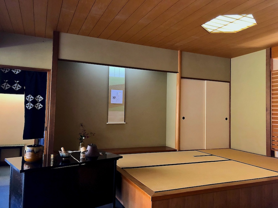 「茶室」だけれど、オールドスタイルではなくどちらかと言えばモダン…「現代数寄屋建築」といった趣きが白砂の広がる玄関前からも感じられる松韻亭。敷地の手前は立礼席や広間、そして能舞台を備えた主棟「松韻亭」、そして庭園を挟んだ奥には四畳半の小間「萩庵」から構成されます。建物の施工は創業100年以上の歴史をほこる東日本の数寄屋造建築の第一人者・水澤工務店。