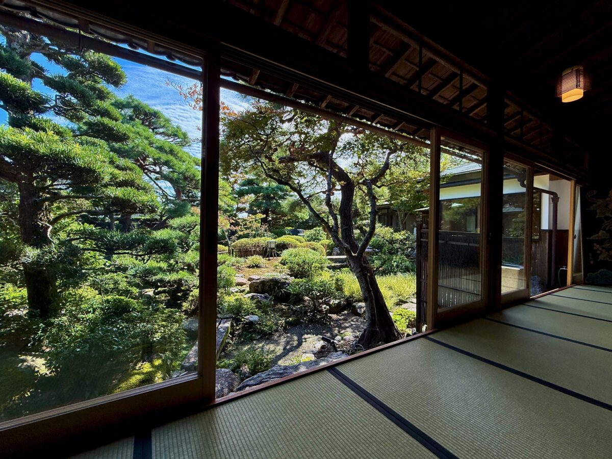 現在の庭園はより大きな広間からがメインのビューポイントにも思える…けど、現在の広間より先にあった建築は御在所。明治天皇は竹の子屋に滞在の際に、庭の池の生けた鯉や鰉(ヒガイ)を掬って喜びになられた——というエピソードがあるとか。今のお庭は池泉が目立つお庭…というよりはマツやサツキ・ツツジの多くの刈込み等からなる植栽と「流れ」が中心のお庭と印象で、“近代以降”の日本庭園といった趣き。