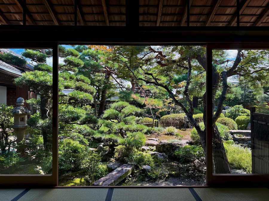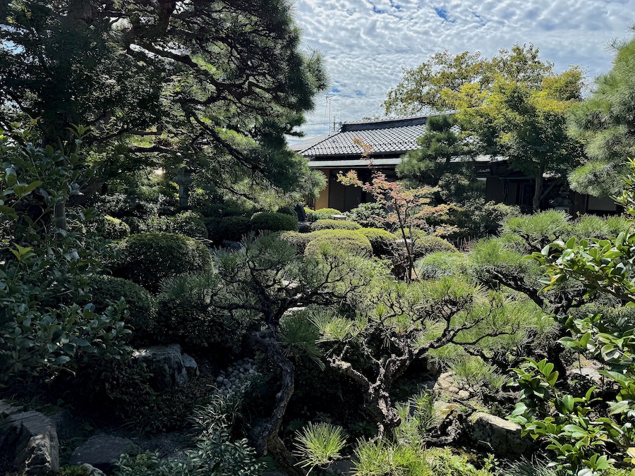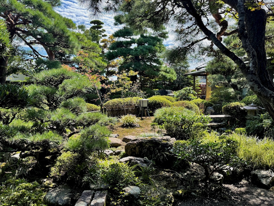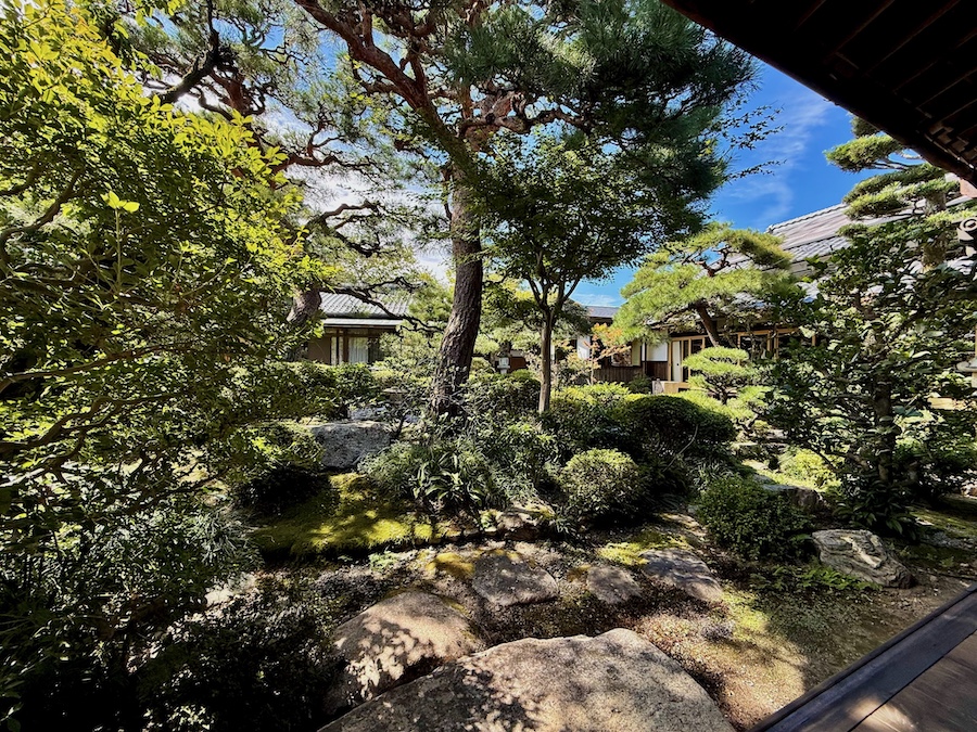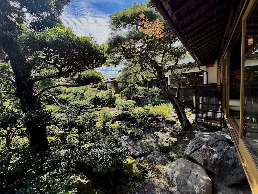現在の庭園はより大きな広間からがメインのビューポイントにも思える…けど、現在の広間より先にあった建築は御在所。明治天皇は竹の子屋に滞在の際に、庭の池の生けた鯉や鰉(ヒガイ)を掬って喜びになられた——というエピソードがあるとか。今のお庭は池泉が目立つお庭…というよりはマツやサツキ・ツツジの多くの刈込み等からなる植栽と「流れ」が中心のお庭と印象で、“近代以降”の日本庭園といった趣き。