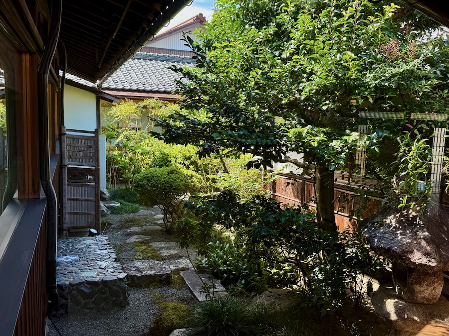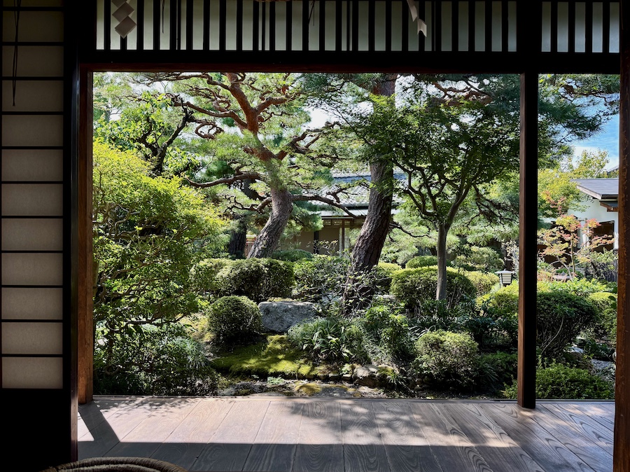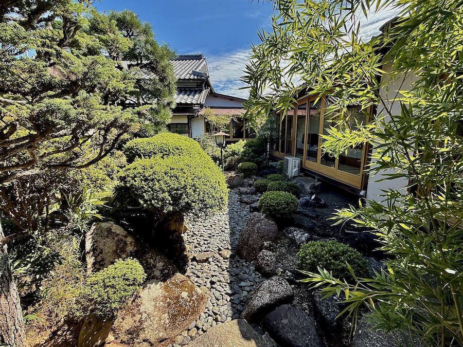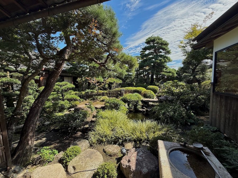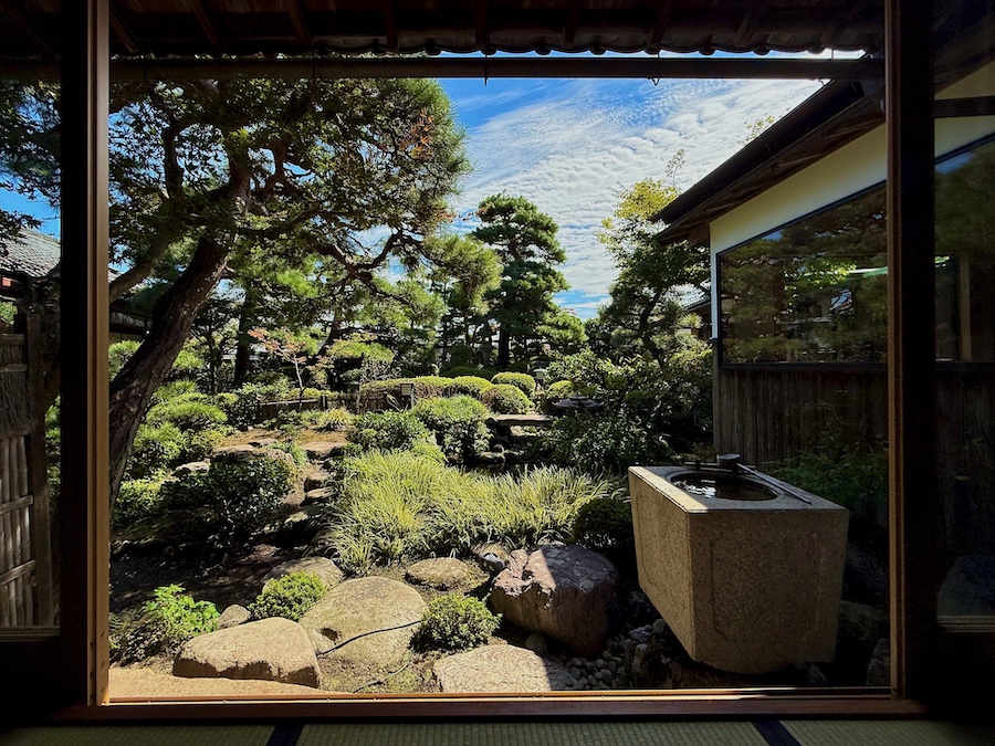 現在の庭園はより大きな広間からがメインのビューポイントにも思える…けど、現在の広間より先にあった建築は御在所。明治天皇は竹の子屋に滞在の際に、庭の池の生けた鯉や鰉(ヒガイ)を掬って喜びになられた——というエピソードがあるとか。今のお庭は池泉が目立つお庭…というよりはマツやサツキ・ツツジの多くの刈込み等からなる植栽と「流れ」が中心のお庭と印象で、“近代以降”の日本庭園といった趣き。