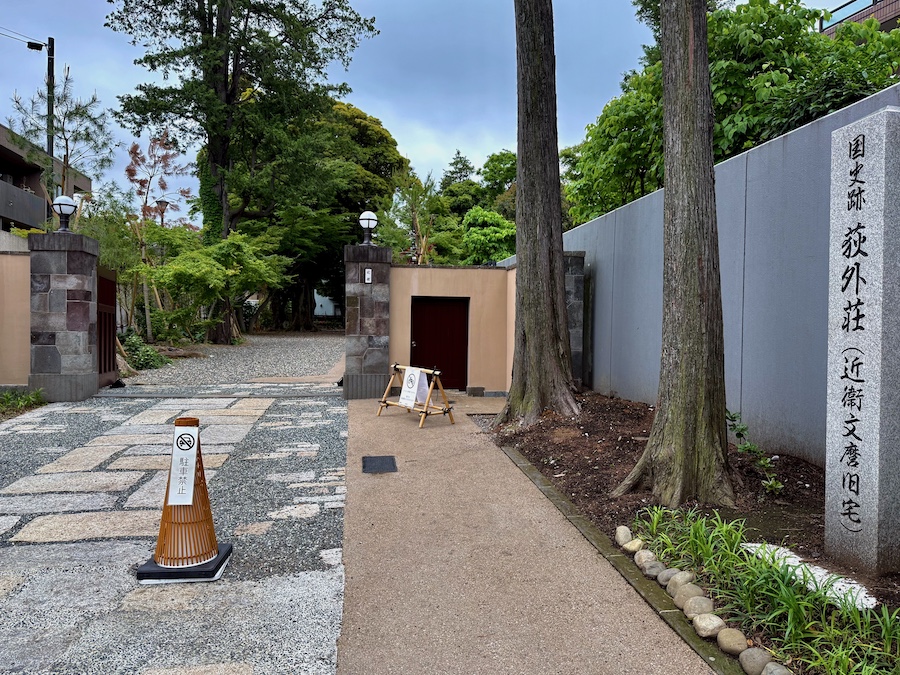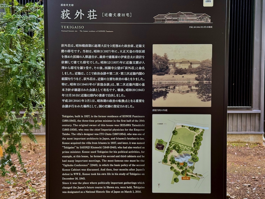 「荻外荘」(てきがいそう)は東京都杉並区に残る、昭和時代前期に内閣総理大臣を3度務めた近衛文麿の旧別邸。「荻外荘(近衛文麿旧宅)」の指定名で国指定文化財(史跡)。敷地の一部(現在の芝生広場)が『荻外荘公園』として2015年より公開されていましたが、旧邸も建築の復原・整備を経て2024年より公開が開始されました。