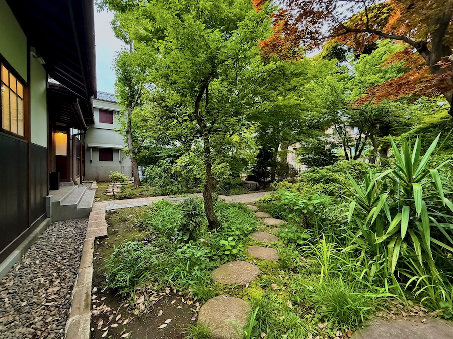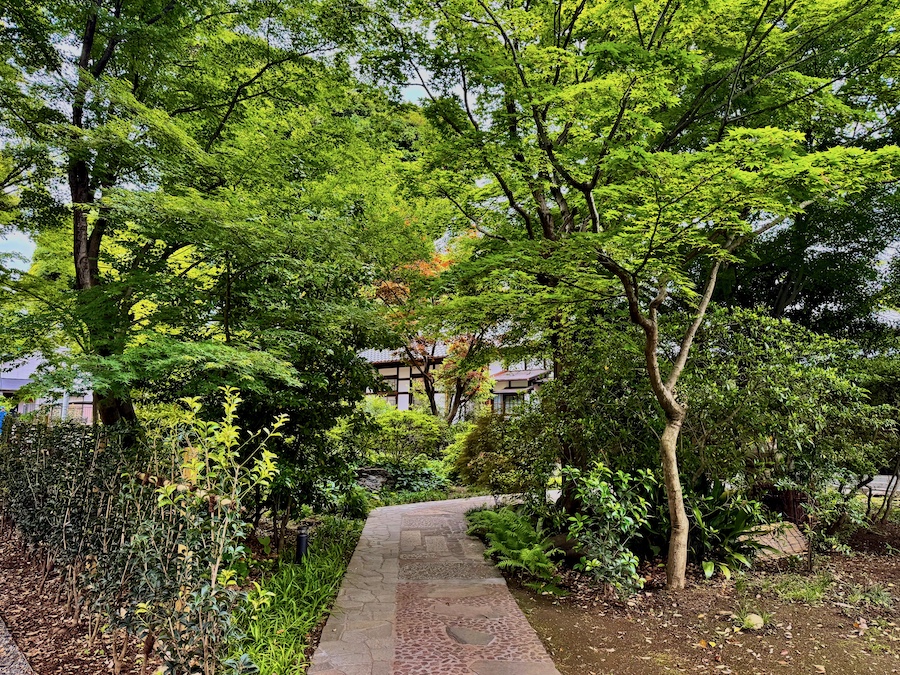 主庭園と比べて、当時から変わっていない、近代〜昭和時代初期・中期の雰囲気が感じられるのは玄関前の受付周辺の園路。赤い小石が埋め込まれた石畳(延段)もすごくかっこいいけれど、これは今回に合わせて整備されたもの…?(なんだか歴史を感じる)