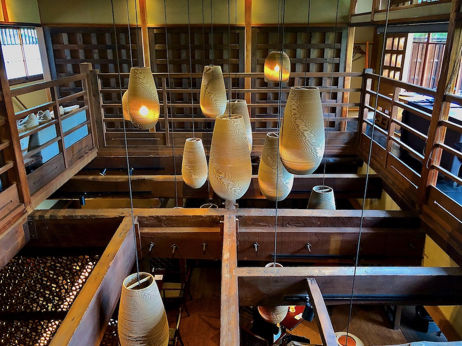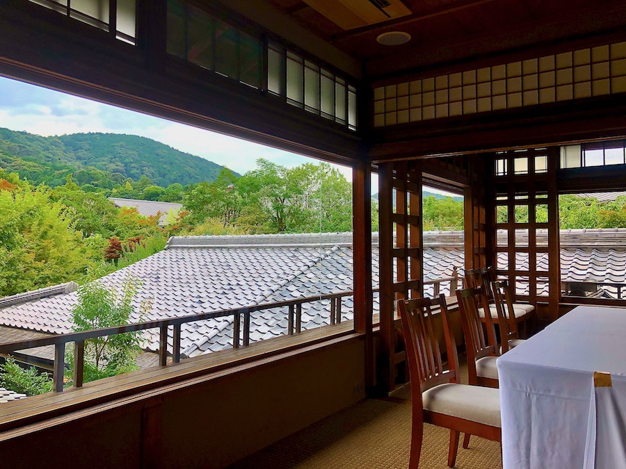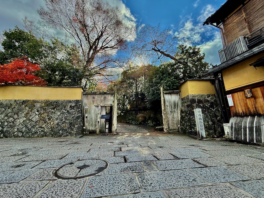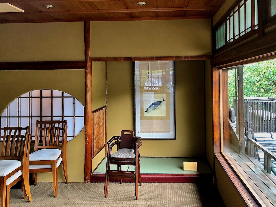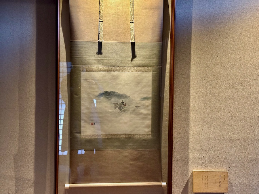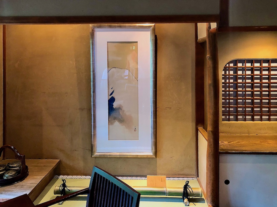 この現在では観光の一等地で、約2,000坪もの敷地の広さをほこるお屋敷…。そのアプローチの石畳も厳かでかっこいい。最初に現れるのが築約100年となるかつての主屋。内装はリノベーションされている所も多いですが(特に、メインの食堂部分が吹き抜けになっている点など)、各所の木材や床の間は当時の面影を感じさせます。2階部には八坂の塔を目の前にのぞむ洋室もある近代和風建築――室内の所々に竹内栖鳳の作品が展示されている点も見どころ!