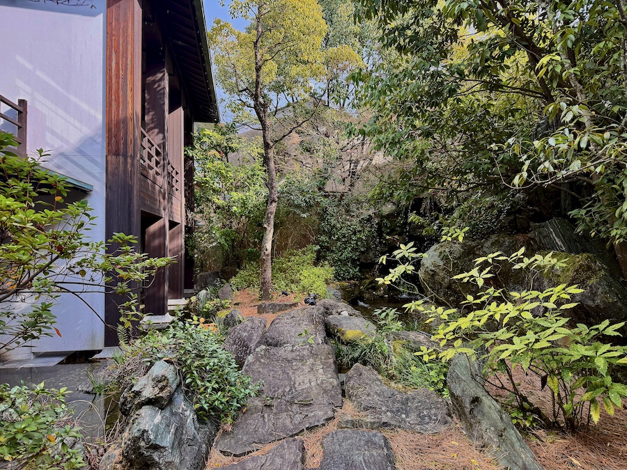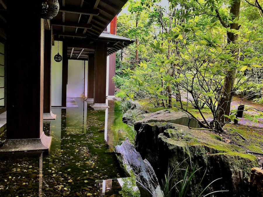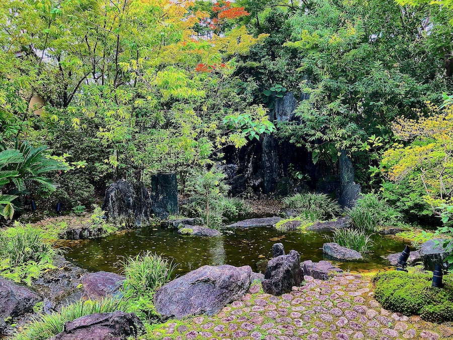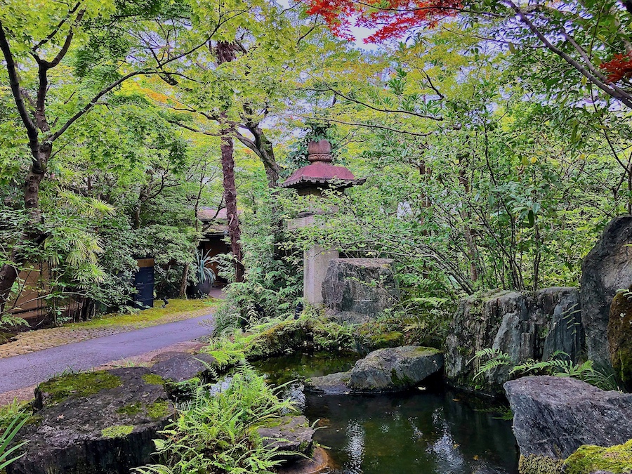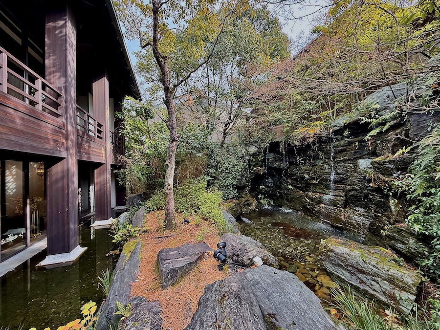 お庭について。メインの食堂から眺められる中庭は丸い伽藍石(庭伽藍)が置かれたりと当時(近代)らしい雰囲気も感じさせるのですが、小川が巡らされ一つの回遊式庭園の様になっている敷地内の回遊路や、その途中途中にある池泉庭園は2010年代のリニューアルの際に新たに作庭されたもの。