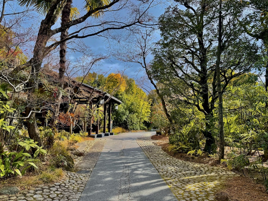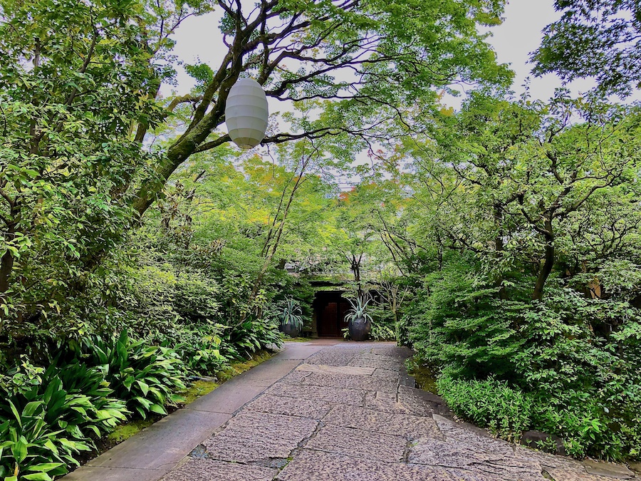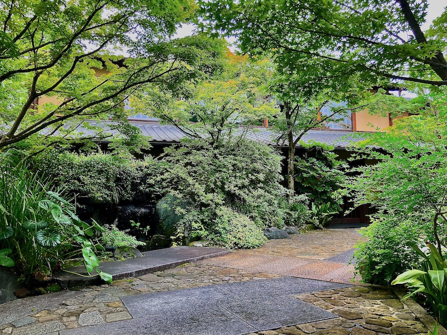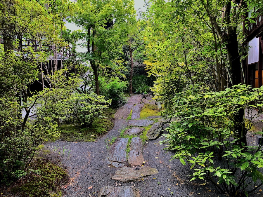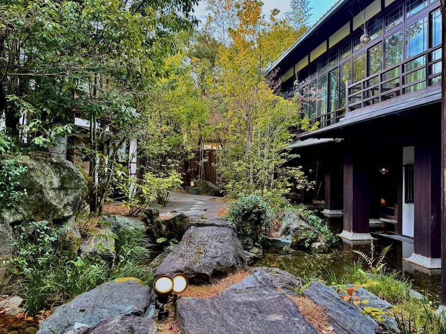 お庭について。メインの食堂から眺められる中庭は丸い伽藍石(庭伽藍)が置かれたりと当時(近代)らしい雰囲気も感じさせるのですが、小川が巡らされ一つの回遊式庭園の様になっている敷地内の回遊路や、その途中途中にある池泉庭園は2010年代のリニューアルの際に新たに作庭されたもの。