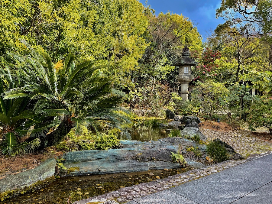 作庭を手掛けた阿波三松園さんはその名の通り徳島の造園会社。青石をふんだんに使っている点だけでなく、どこか南国風な?オリエンタルな雰囲気の植栽も特徴的…。