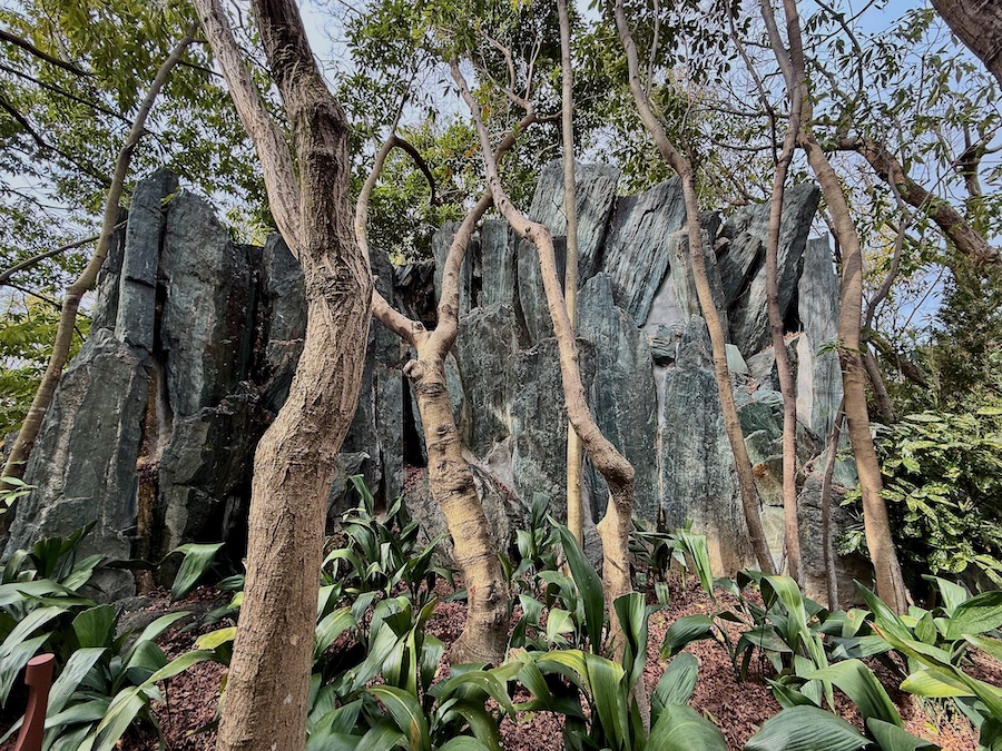 特に、その際に新築された「THE COZY MUSIC HALL」棟を挟んで北と南にある池泉庭園。京都では昭和の人気作庭家・重森三玲が好んだ“青石”(緑泥片岩)がこの庭でも多く使われ、特に北庭は青石で組まれた山脈の様な滝石組がとても迫力があって素晴らしい!そして南庭も青石の凸凹をそのまま園路にしていて、徳島の名庭園『旧徳島城表御殿庭園』の様な感覚が味わえる…。
