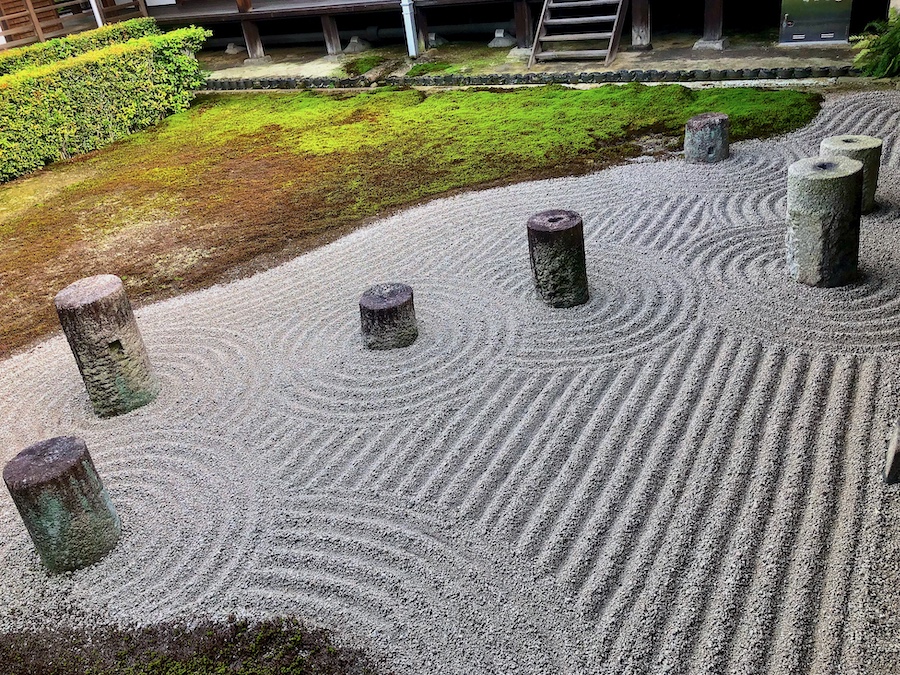 上で書いた通り、建物の四方ごとに庭園のデザインが変わりますが、そのうち最初に目に入るお庭が2つ。その一つは、方丈から正面に眺める(順路で言うと、最初に渡る橋の左手側に現れる)「南庭」。こちらは本坊庭園の中では最も古典的な雰囲気で、禅を感じさせる石庭。ここでは先の要素の中から「蓬莱」「方丈」「瀛洲」「壺梁」、そして右手側にある苔の緩やかな築山が「五山」を表しています。