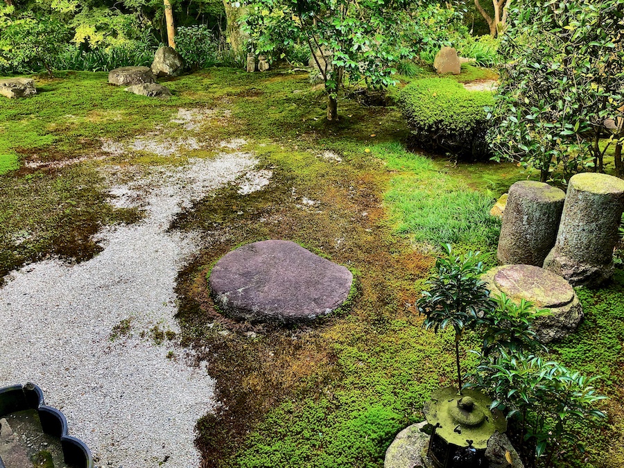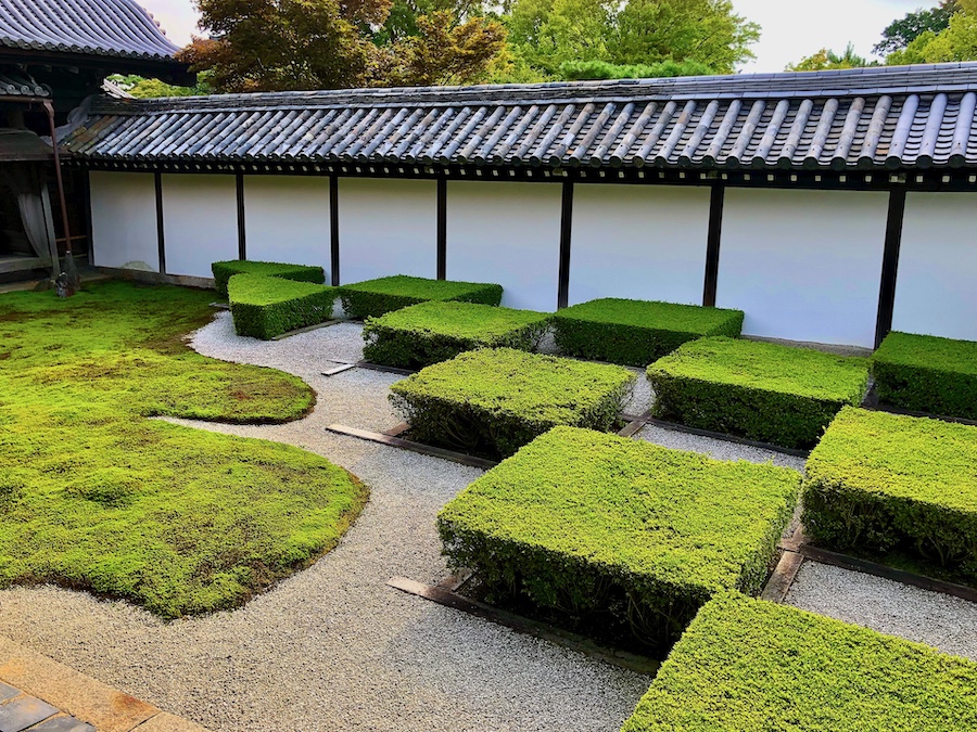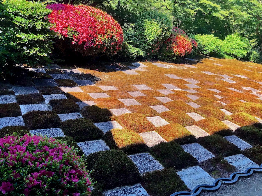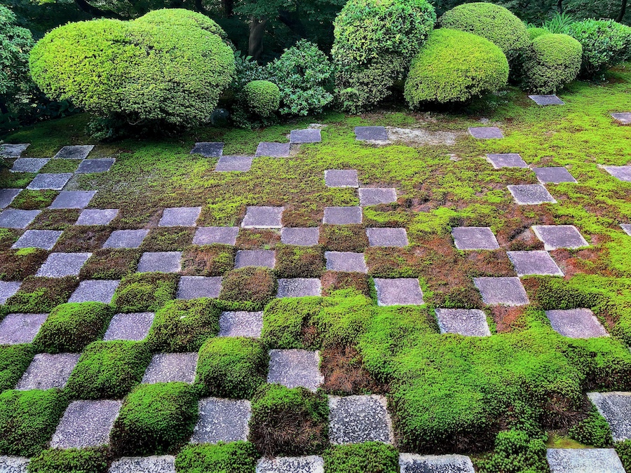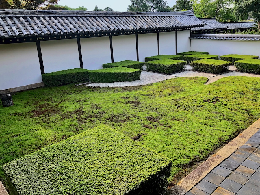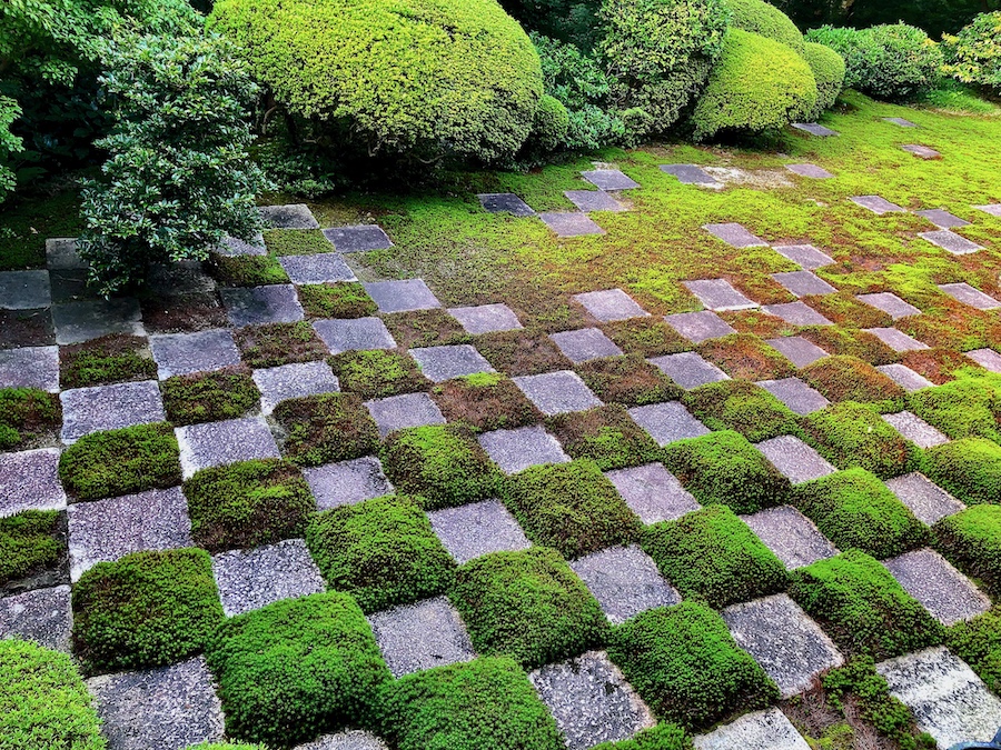 そして、雑誌やテレビでも取り上げられる機会の多い?苔と石板で市松模様が描かれた「北庭」。今やこの姿こそが“東福寺のお庭!”という印象ですが、先述の重森千靑さんんお解説によると元々は「白砂と石板による市松模様」だったそうで、こんな苔庭ではなかったんだそう。近年、京都は猛暑で“苔がピンチ”と言われたりするので――いつか苔の維持の方が難しくなった時には、作庭当初の姿を復元されることもあるかもしれませんね。