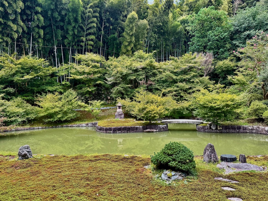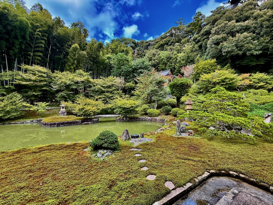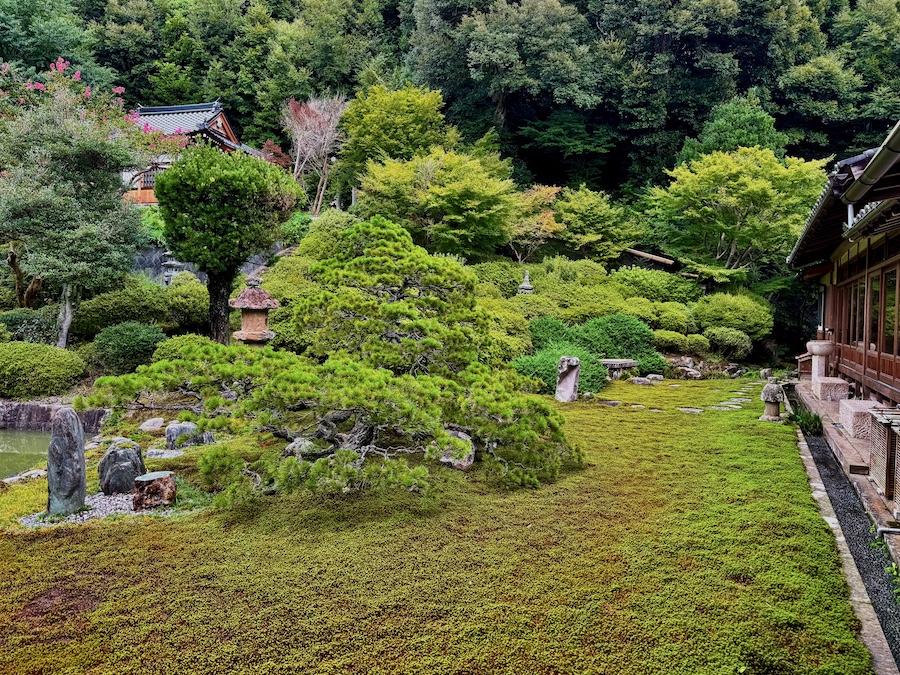 左手側(本堂の奥)には大きな心字池に石橋の架かる池泉鑑賞式庭園。右手側(書院の奥)には一面の苔の中に飛び石が配され、大刈込みの迫力のある茶庭風の庭園。よくお手入れされたクロマツは樹齢300年とも言われ、当初の山号「龍虎山」にちなんでクロマツを龍に、斜面のサツキの大刈込みは虎を見立てて表現しているとか。