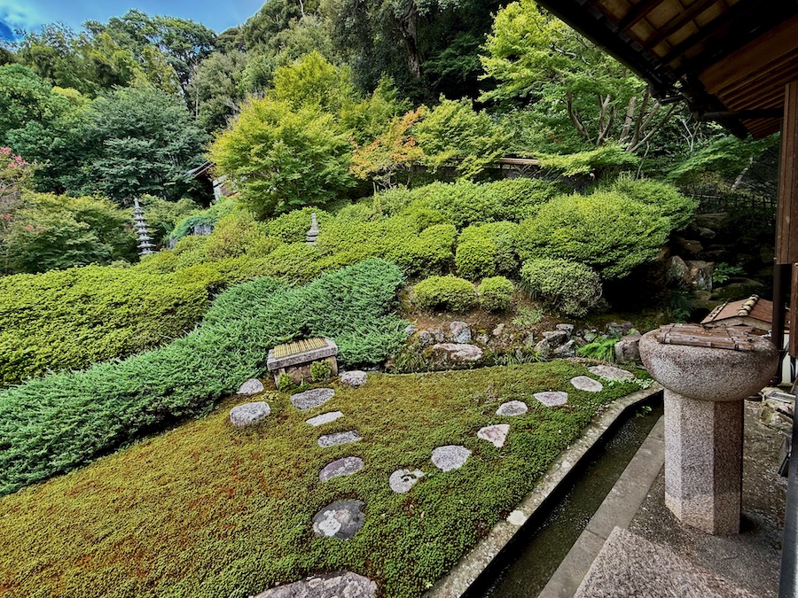 古い写真を見せていただいた限り改修前は苔ではなく白砂が主体のいわゆる「出雲流庭園」的な雰囲気。そこからだいぶ変わってはいるもの――今の庭園は今の庭園でとても美しい!そして見比べて変わっていない点もある。先述の龍と虎に見立てた植栽や書院から少し離れた位置にポツンとある手水鉢、その奥の石灯籠などなど。山の上にある鎮守堂も良いアイキャッチに。