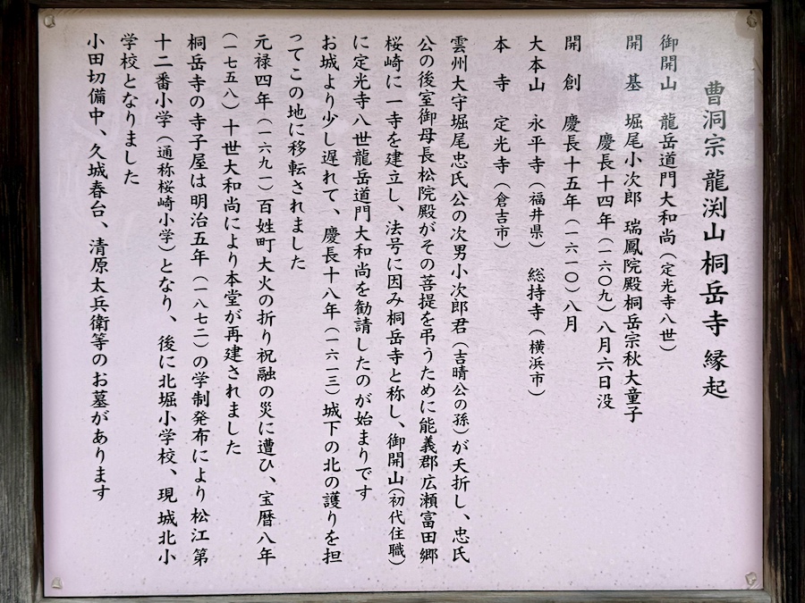 その歴史について。創建は江戸時代初めの1610年(慶長15年)。初代松江藩主・堀尾忠氏の子で二代藩主・堀尾忠晴の弟、堀尾吉晴の孫にあたる小次郎がその前年に夭折(早死に)され、その菩提を弔う為に母(忠氏の正室)・長松院(豊臣家の五奉行・前田玄以の娘)により建立。当初は松江城の前の居城『月山富田城』城下にありましたが、松江城築城に伴って1613年に現在地に移転しました。