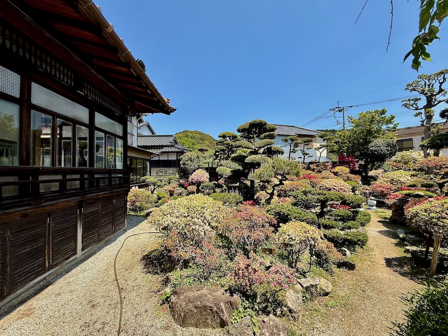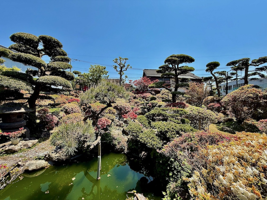 建築の前には池泉回遊式の日本庭園が広がります。その見所は色とりどりのツツジで、40種類150〜200本というツツジの花が例年4月になると見頃を迎えます。当初からこの形かは不明ですが、建築と同時期に作庭された庭園(とのこと)で、昭和時代にはすでに地域では「つつじの名所」として知られていたそう。