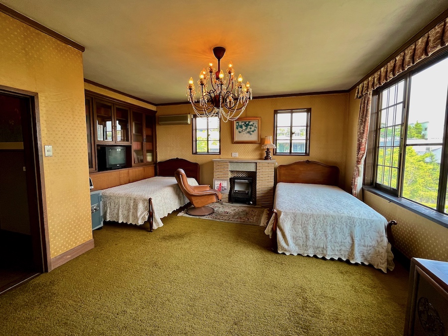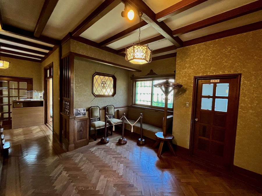 ハーフティンバー様式の玄関、スパニッシュ風のタイルが迎えてくれる旧山本家。そこからステンドグラスのある応接室、客間、書斎…と洋間が続くものの、庭園に面した主座敷(主人の間)と縁側から一転、畳・日本庭園・茶室と“和”の空間に。職人技が光る手すりの階段を登ると2階にはシャンデリアのある洋室(寝室)に、仏間のある和室…。