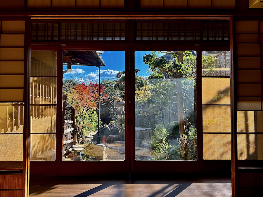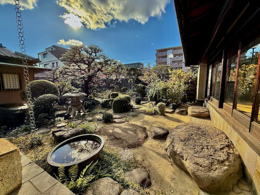 主屋から正面に見て雪見灯篭、踏分石、主木のマツ、枯池、茶室…と色んなアイキャッチが視界に入る“鑑賞性”と、主屋から二手に渡って茶室へと至る茶庭・露地としての2つの意味合いを持たせた庭園。庭石には近藤寿一郎の地元・鳥取県日野町根雨の川から運ばれたものが用いられているそう(特に靴脱石が変わってる!)