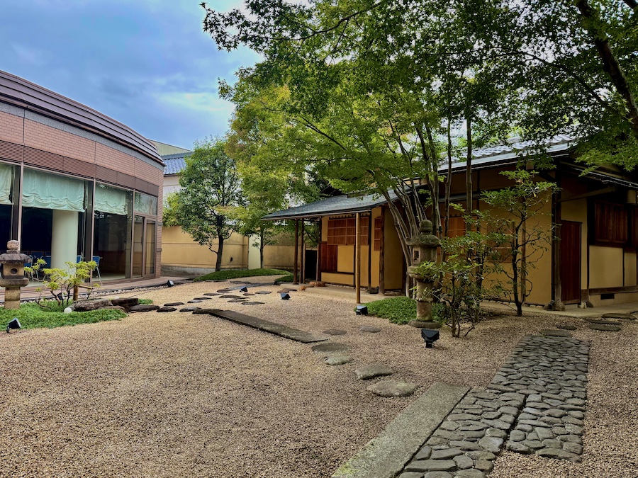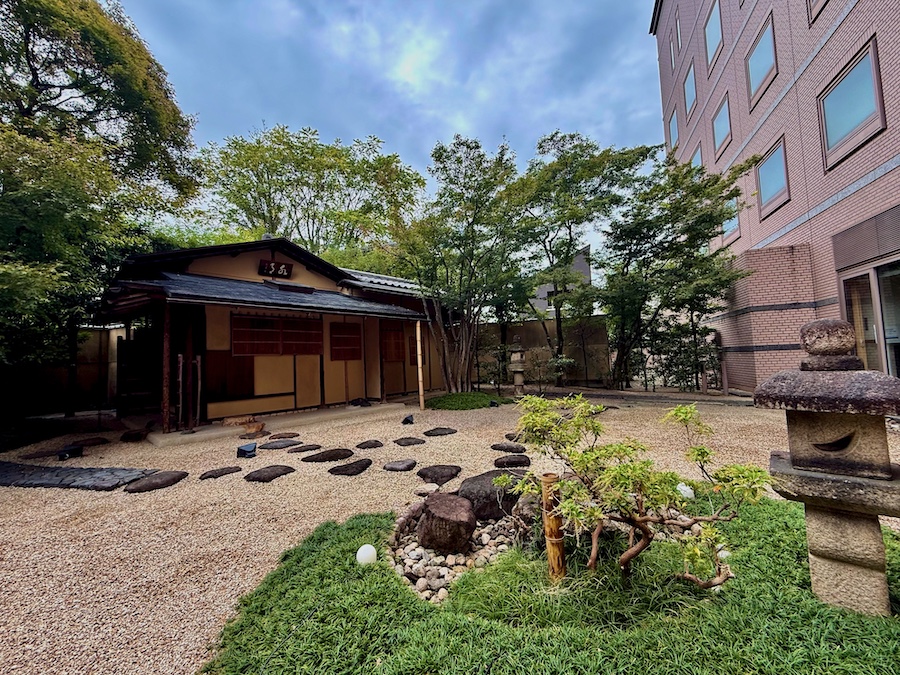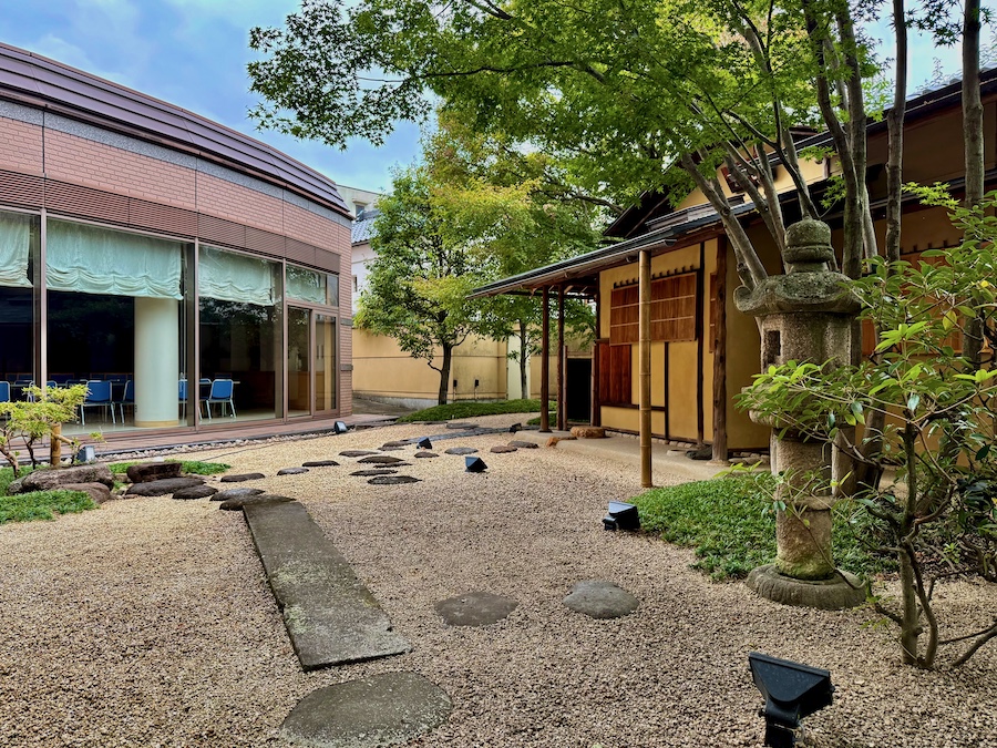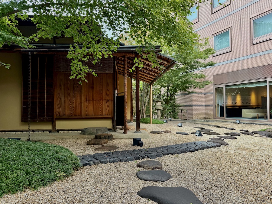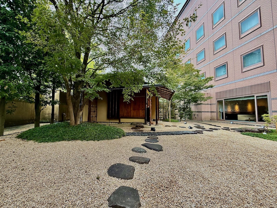 そして庭園の作庭を手がけたのは、昭和の東京を代表する作庭家・岩城亘太郎(岩城造園)。(※年代的に、現在の庭園がそうなのか元の庭園がそうだったのかは曖昧…岩城さんは西川富太郎が共に仕事をした吉田五十八の建築にも、水澤工務店さんの茶室にもそれぞれ実績がある)。茶室を中心とした茶庭/露地なのですが、苔むした京都の様な茶庭…というよりは「出雲流庭園」の様な白砂の中に飛び石や延段の配されたスタイルというのがとても特徴的(でも延段には京都の銘石・真黒石が敷き詰められている!)。ロビーから眺めると僅かながら盆地の北側の山々が借景となっています。