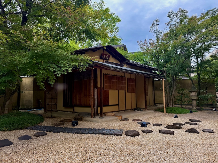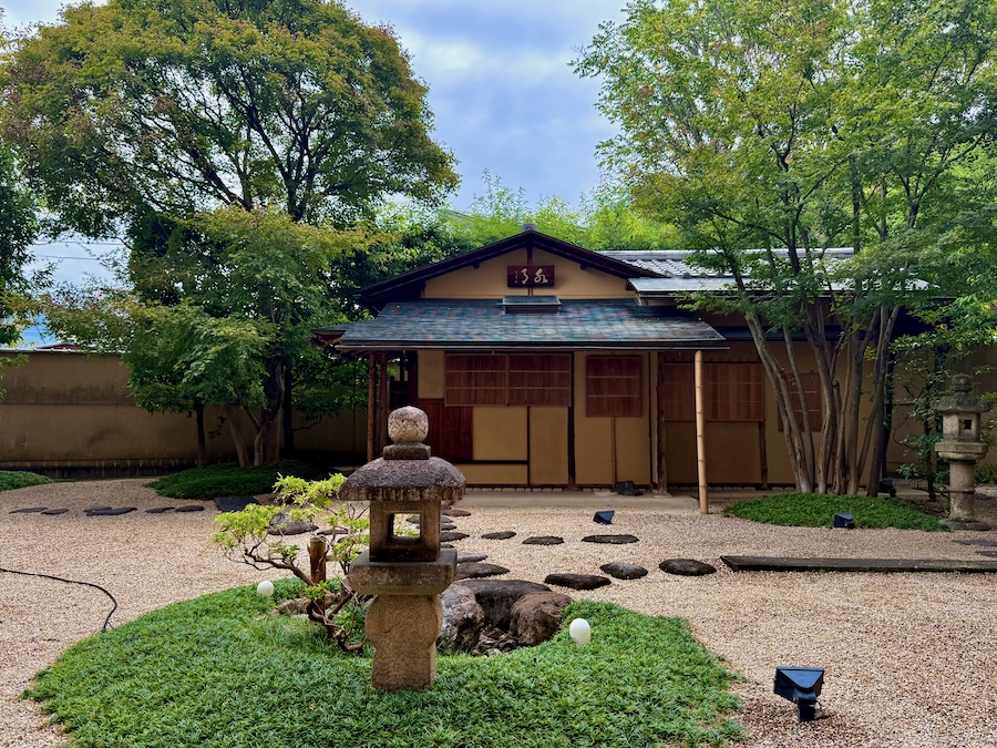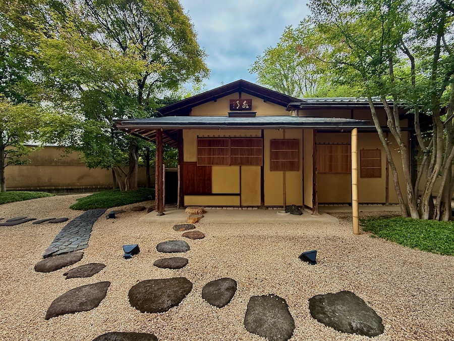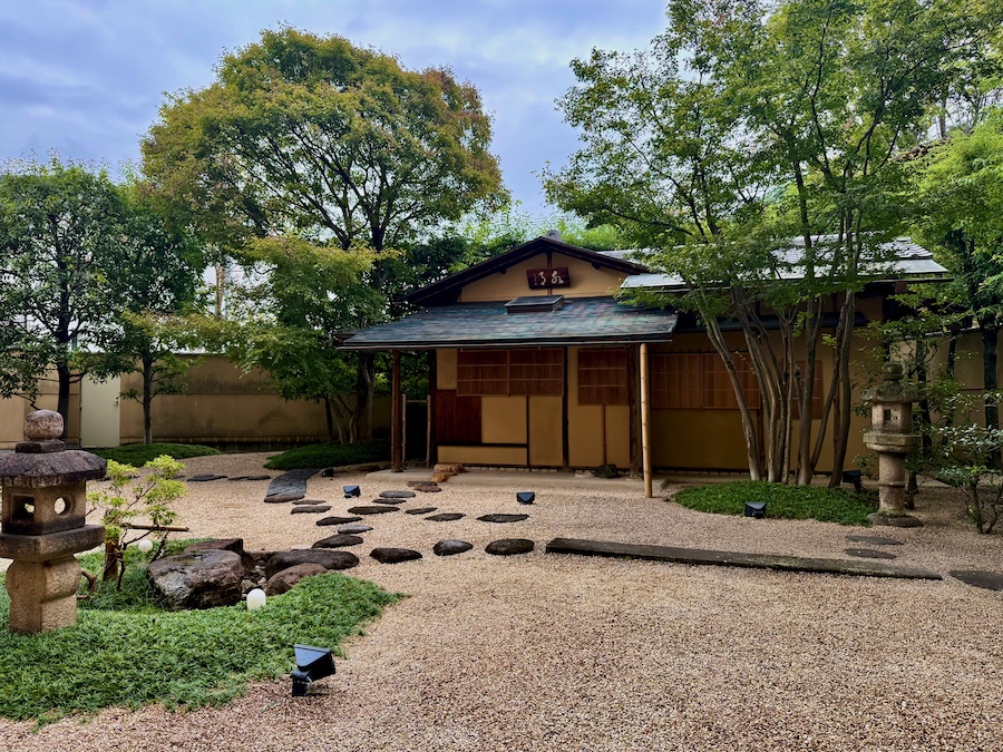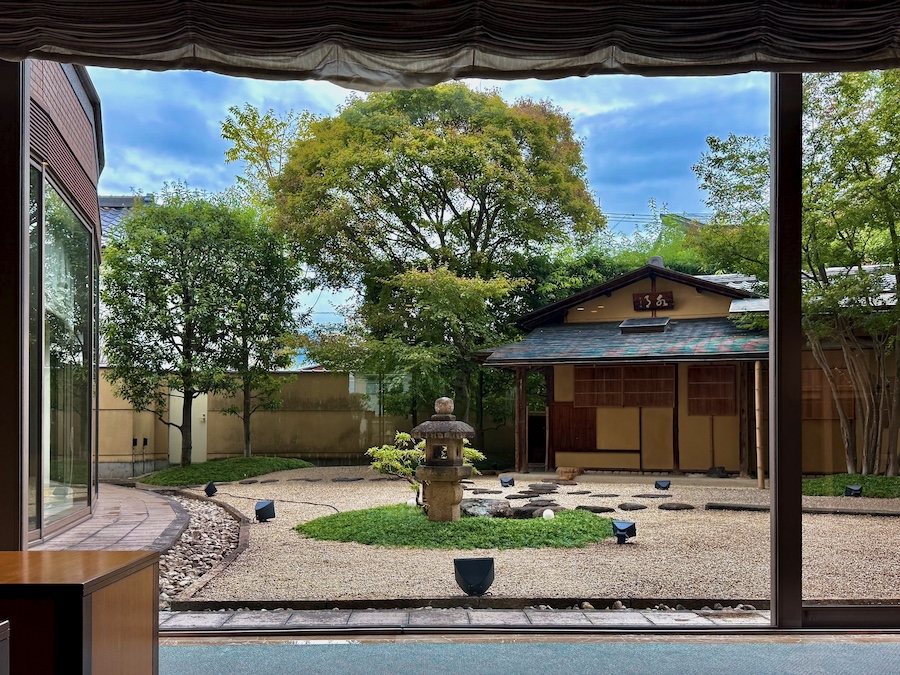 そして庭園の作庭を手がけたのは、昭和の東京を代表する作庭家・岩城亘太郎(岩城造園)。(※年代的に、現在の庭園がそうなのか元の庭園がそうだったのかは曖昧…岩城さんは西川富太郎が共に仕事をした吉田五十八の建築にも、水澤工務店さんの茶室にもそれぞれ実績がある)。茶室を中心とした茶庭/露地なのですが、苔むした京都の様な茶庭…というよりは「出雲流庭園」の様な白砂の中に飛び石や延段の配されたスタイルというのがとても特徴的(でも延段には京都の銘石・真黒石が敷き詰められている!)。ロビーから眺めると僅かながら盆地の北側の山々が借景となっています。