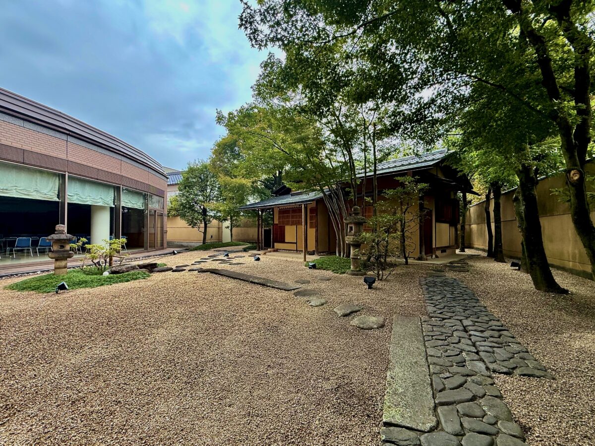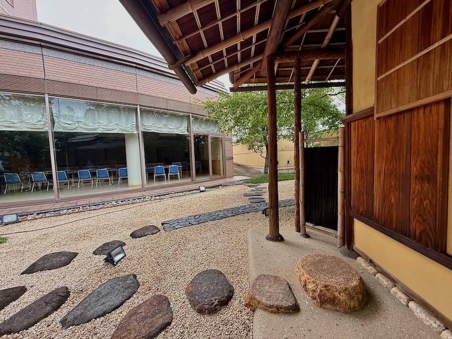 そしてこの資料館(&研修センター)のロビーからはお茶室と庭園(枯山水/露地)が眺められます。(※庭園に関して、通常はロビーから眺めるのみとなりますが、ここでは庭園内の各視点からの写真も紹介。)