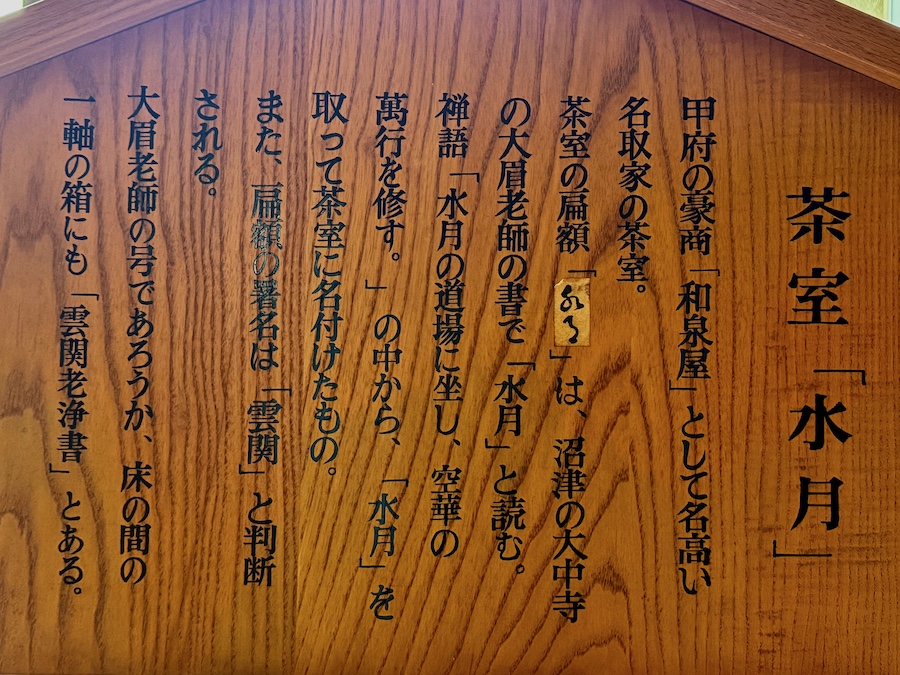 「水月」と名付けられたこのお茶室、元は山梨中央銀行の4代目頭取・名取忠彦の自邸に1964年(昭和39年)に建立されたもの。「名取家」は江戸時代から甲府藩内で豪商として知られた旧家で、忠彦の義父にあたる名取忠愛も同行およびその前身の銀行(第十銀行・山梨貯蓄銀行)の頭取、そして甲府市長も務めた人物。