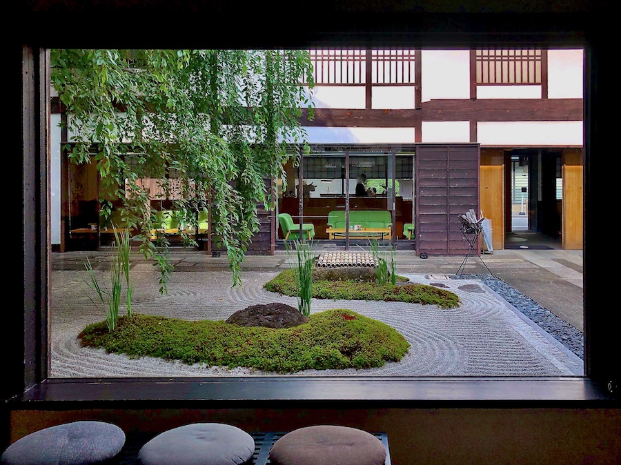 中庭の枯山水庭園は植藤造園により2018年に改修された“天戸ノ庭”。江戸時代から残る井戸はそのまま活かしながら、苔と白砂が美しい庭園。シダレザクラの葉が手前にかかっているので、春には枝垂れとの組み合わせが美しいんだろうな〜。